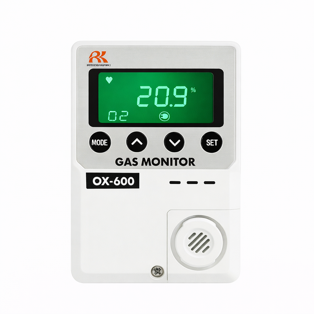 Monitor autónomo de oxígeno para interiores, con display tricolor que indica niveles normales y de alarma. Funciona con AC, DC o baterías AA, usa sensor galvanométrico reemplazable y ofrece alarmas audibles y visuales en un diseño compacto de pared