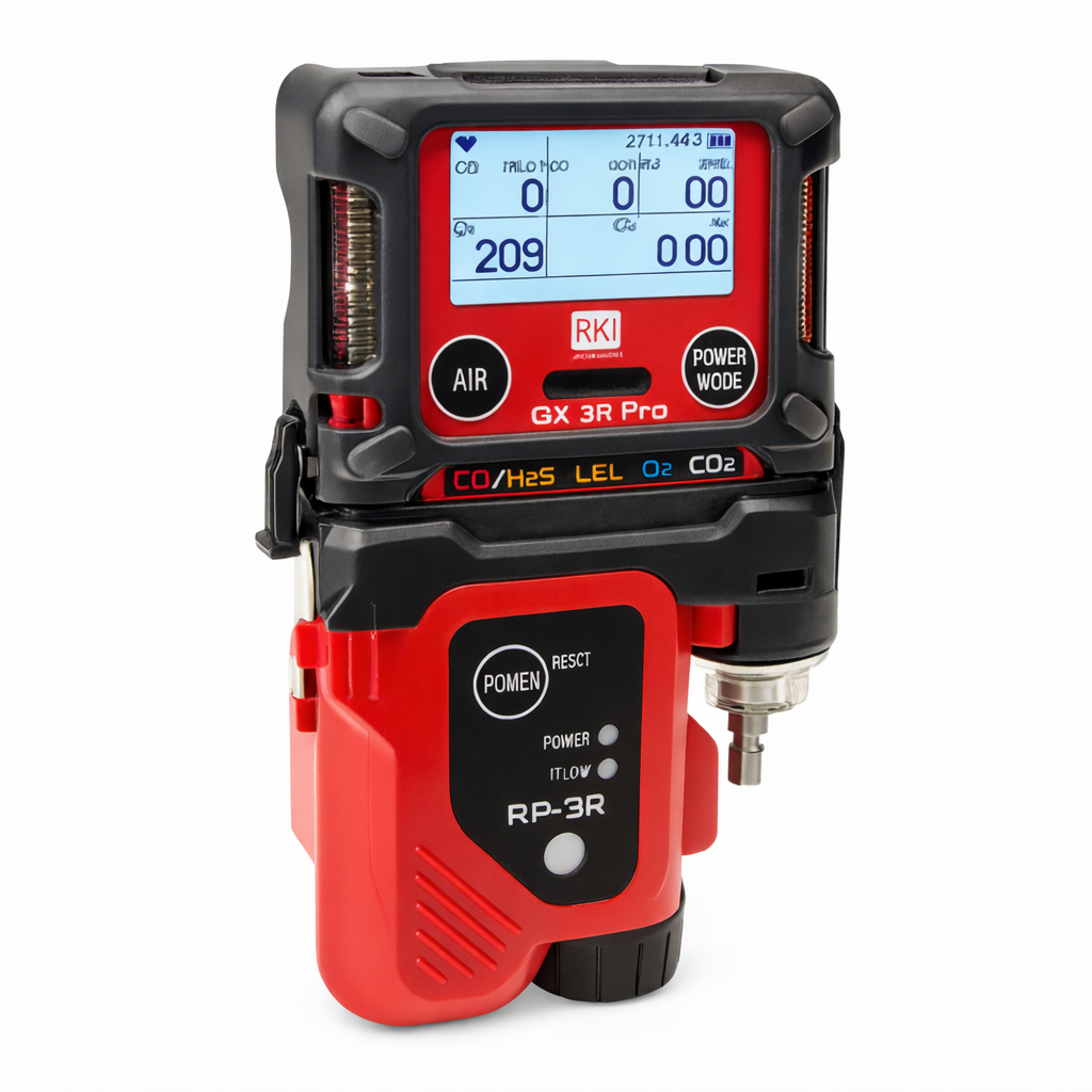 Bomba motorizada para muestreo remoto que se acopla a los monitores RKI GX-3R y GX-3R Pro. Funciona con una batería AA, ofrece hasta 10 horas de operación (o 16 h en modo ECO), detecta flujo bajo y puede utilizar mangueras de hasta 30 m (100 ft) para acceder a espacios difíciles.