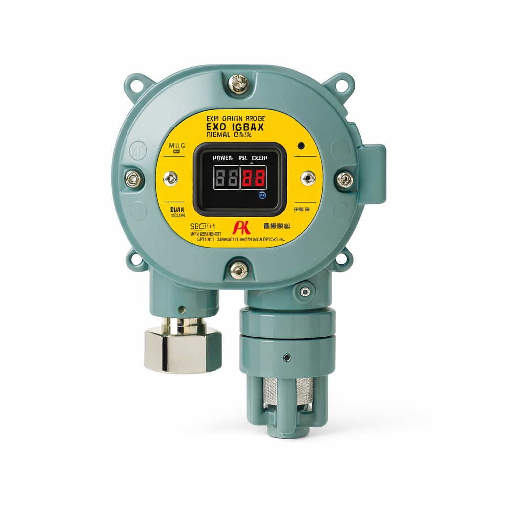 Detector de gas a prueba de explosión, de tres hilos, compatible con sensores electroquímicos, infrarrojos o catalíticos. Incluye pantalla LCD, calibración no intrusiva y salidas 4-20 mA y Modbus, ideal para monitoreo industrial en condiciones exigentes.